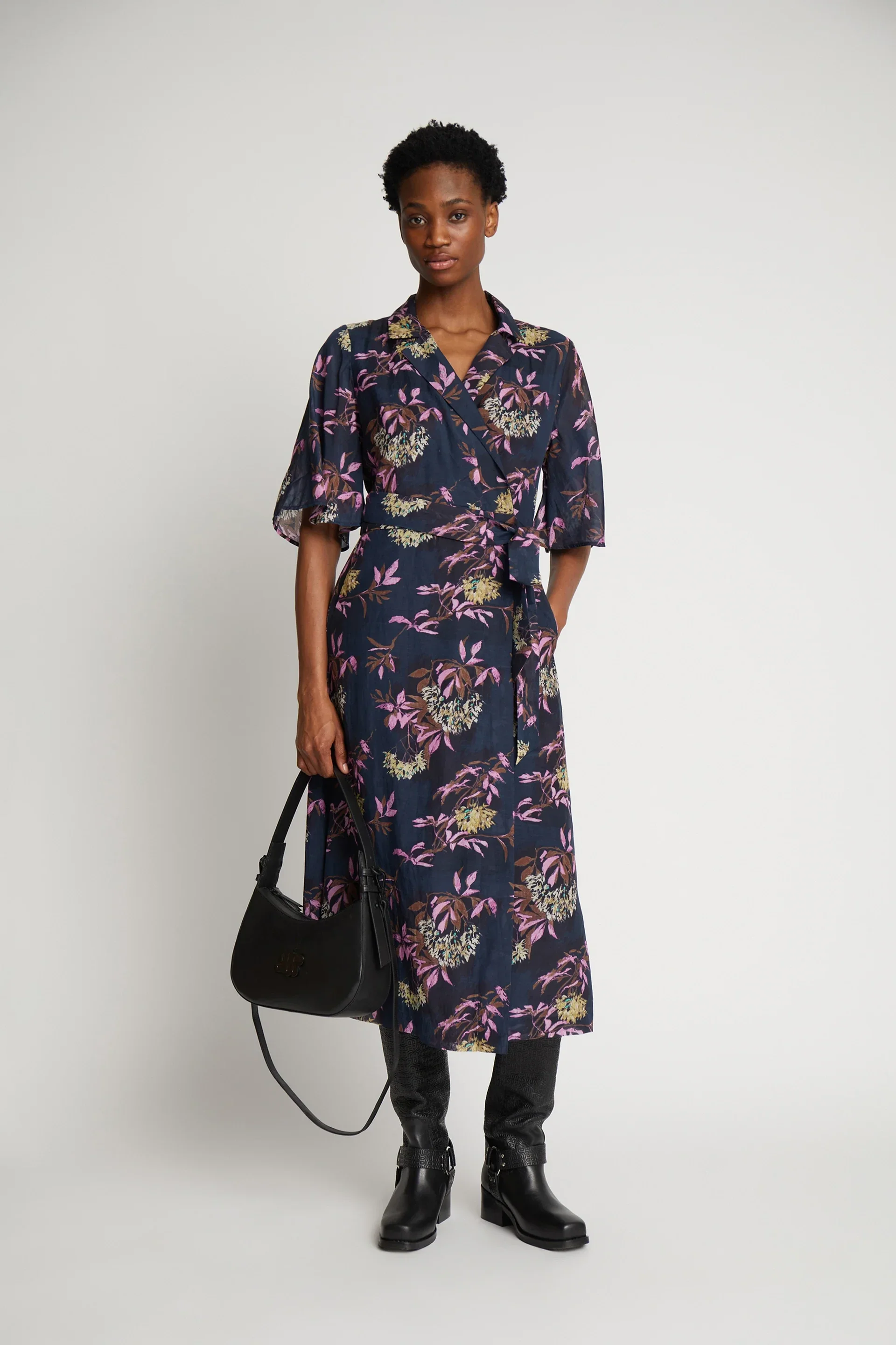 Wikkeljurkje met donkerblauwe bloemenprint.