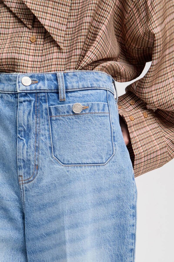 Denimbroek met geperste vouwen, twee verfijnde voorzakken die kunnen worden gesloten met een knoop, en twee achterzakken. Deze denimbroek is voorzien van een elegant MUNTHE leren label op de achterkant en sluit met een rits en een enkele knoop.