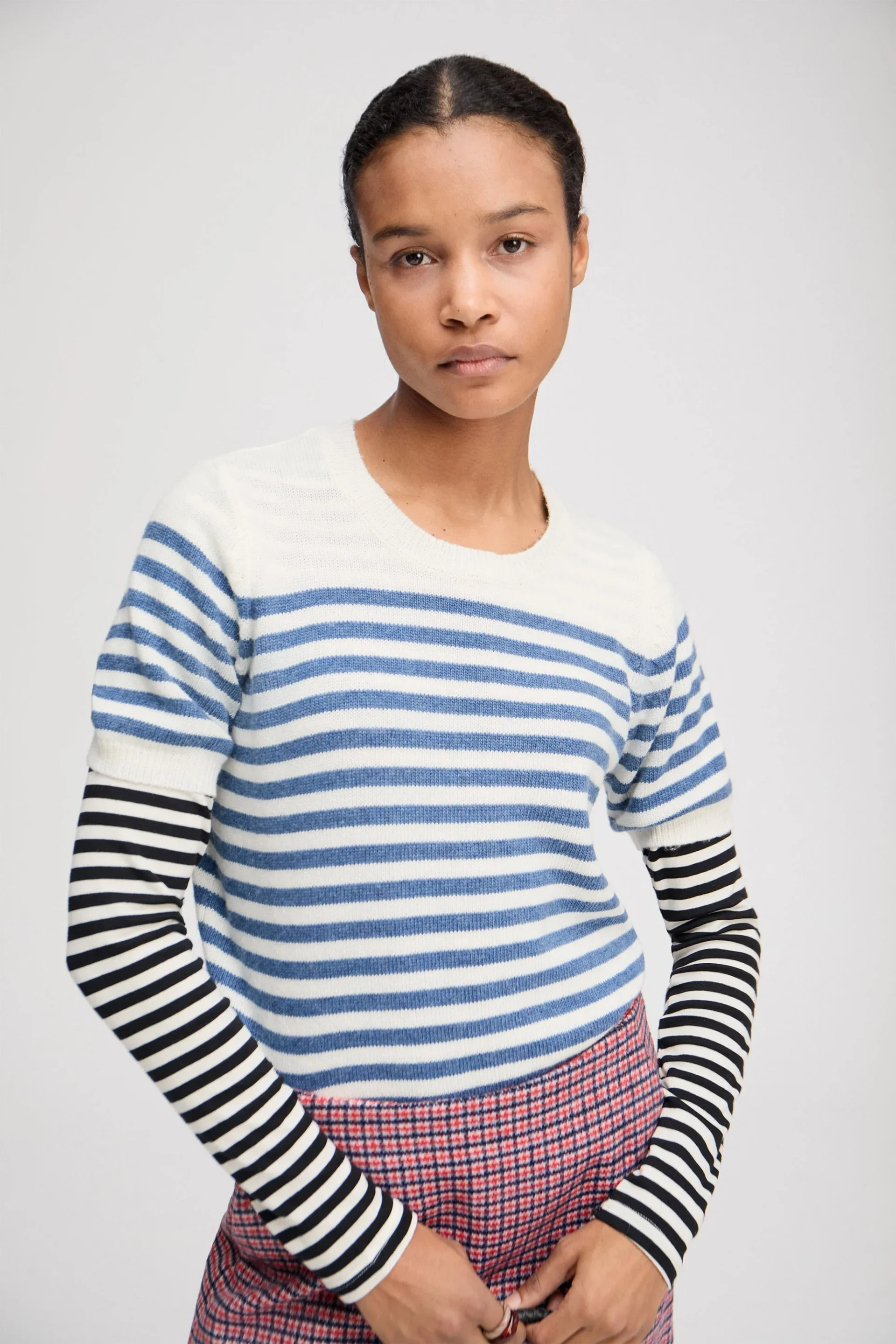 Mooie gebreide trui met elegante strepen en fijne geribbelde details. Deze trui heeft korte mouwen en een ronde halslijn.