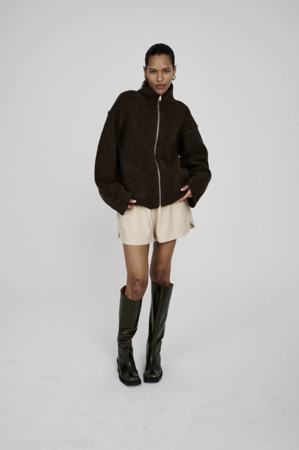 Het sheep knit jack met hoge kraag is gemaakt van een warme, pluizige en uiterst zachte wolmix, waardoor het de perfecte binnen- of buitenjas is tijdens het koude seizoen.