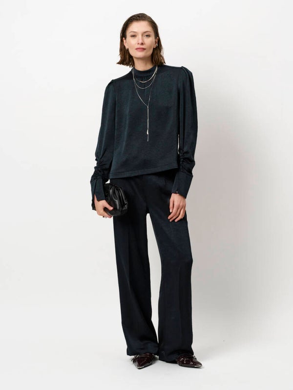 Jules trousers in Midnight Green never go out of style. These flattering pants are made from 100% recycled polyester satin with mechanical stretch. The fabric has a subtle creased effect that adds depth and texture. Designed with a high waist and front pleats, they also feature an elasticated waistband at the back for added comfort.