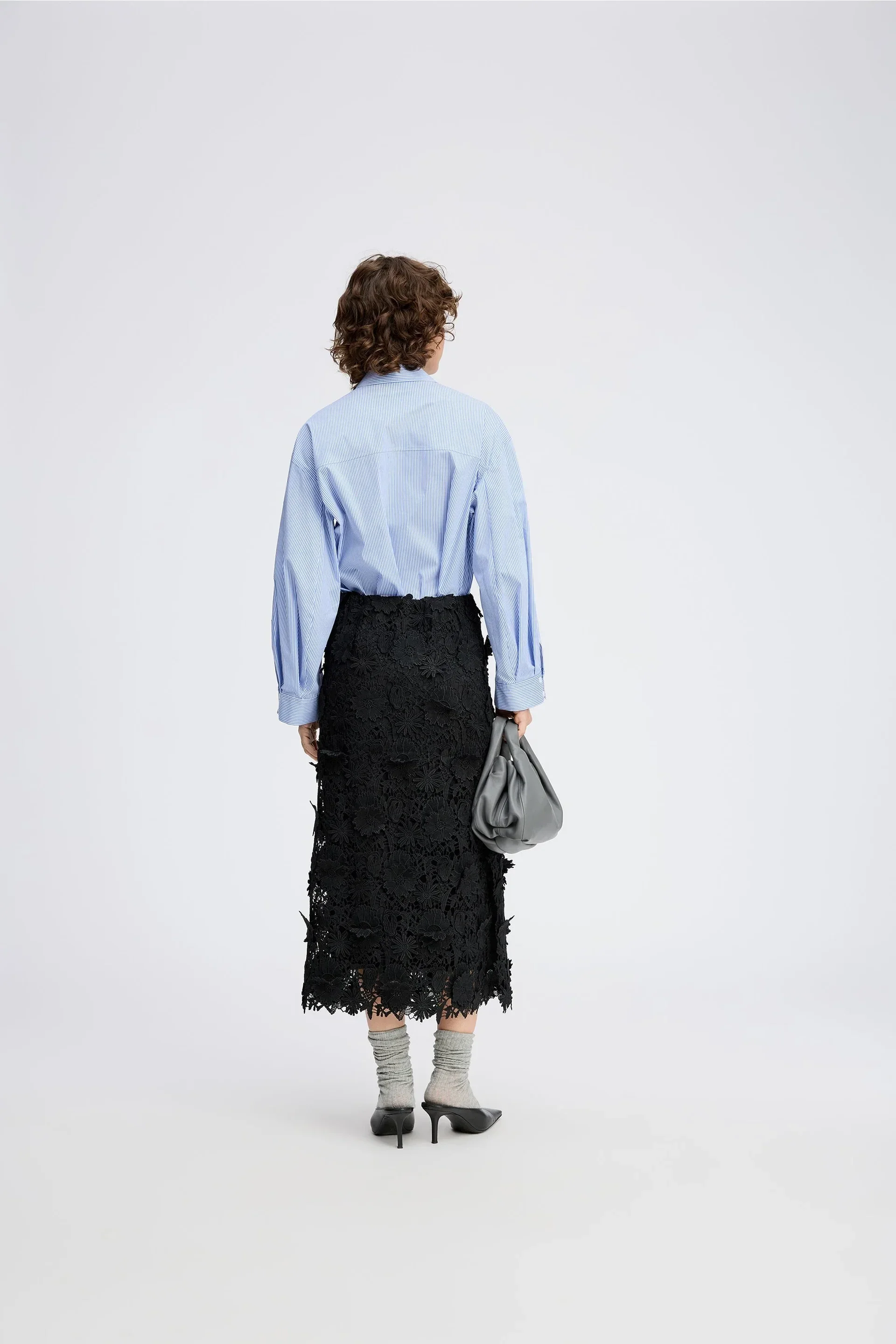 Elegante zwarte rok met prachtige bloemapplicaties van MUNTHE. De rok is voorzien van een zwarte voering en gedeeltelijk doorschijnende details aan de zoom en zijkant, en sluit met een zijrits.
