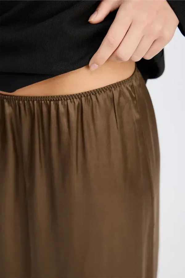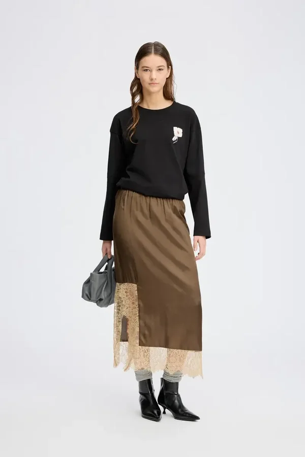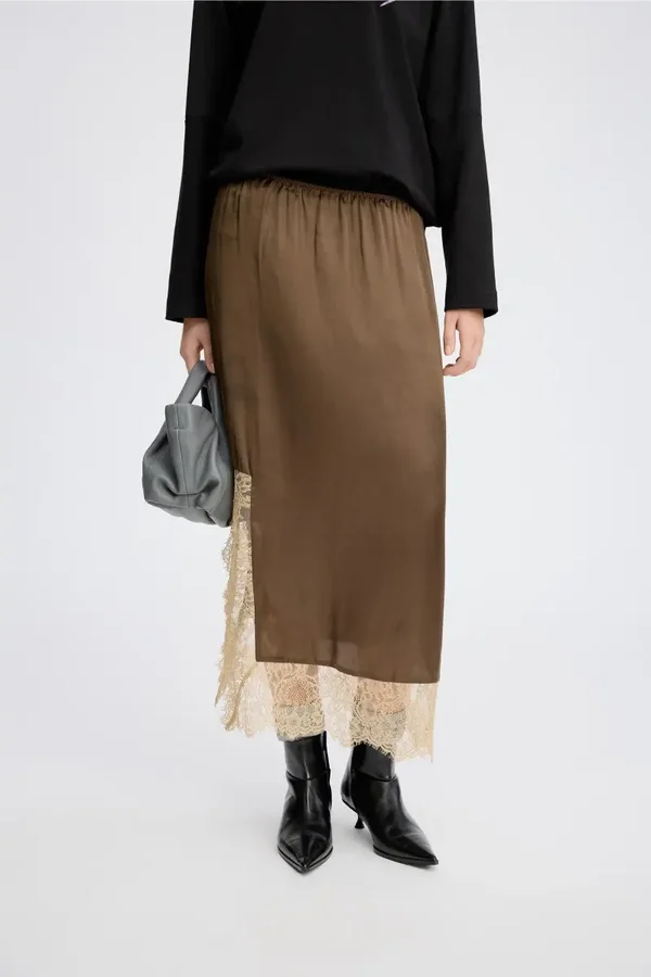 Rok met een prachtig kanten detail langs de zoom en een elegant, asymmetrisch ontwerp dat mooi valt, voorzien van een elastische tailleband voor een comfortabele pasvorm.