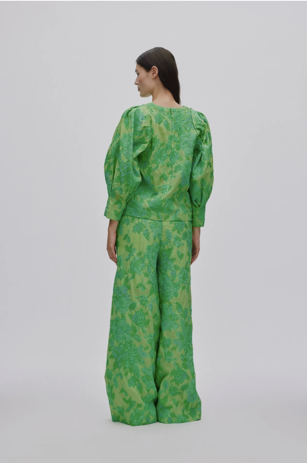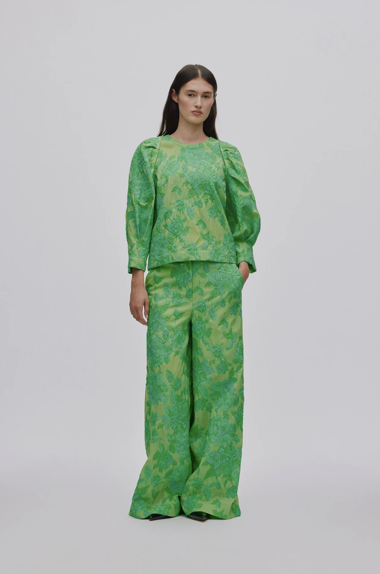 Deze lange, wijde broek is gemaakt van een verfijnde jacquardstof en brengt elegantie in je day-to-night garderobe. De broek heeft een aangesloten taille en een ritssluiting.