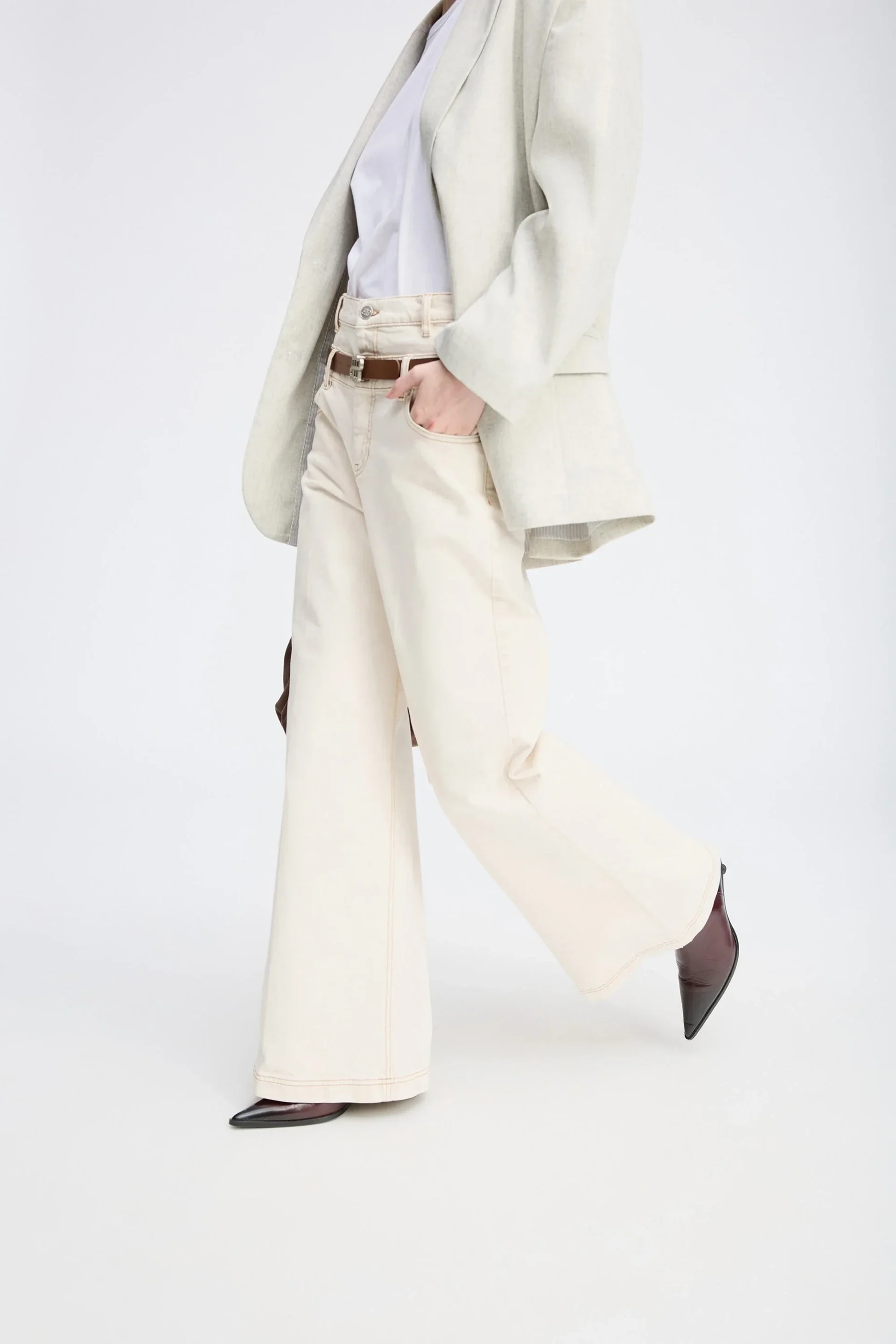Hoge taille broek in off-white denimkwaliteit met contrasterende stiksels. Deze jeans is ontworpen met een prachtig MUNTHE-embleem op de achterzak, wijde pijpen, riemlussen, zakken en een elegante dubbele knoopsluiting.
