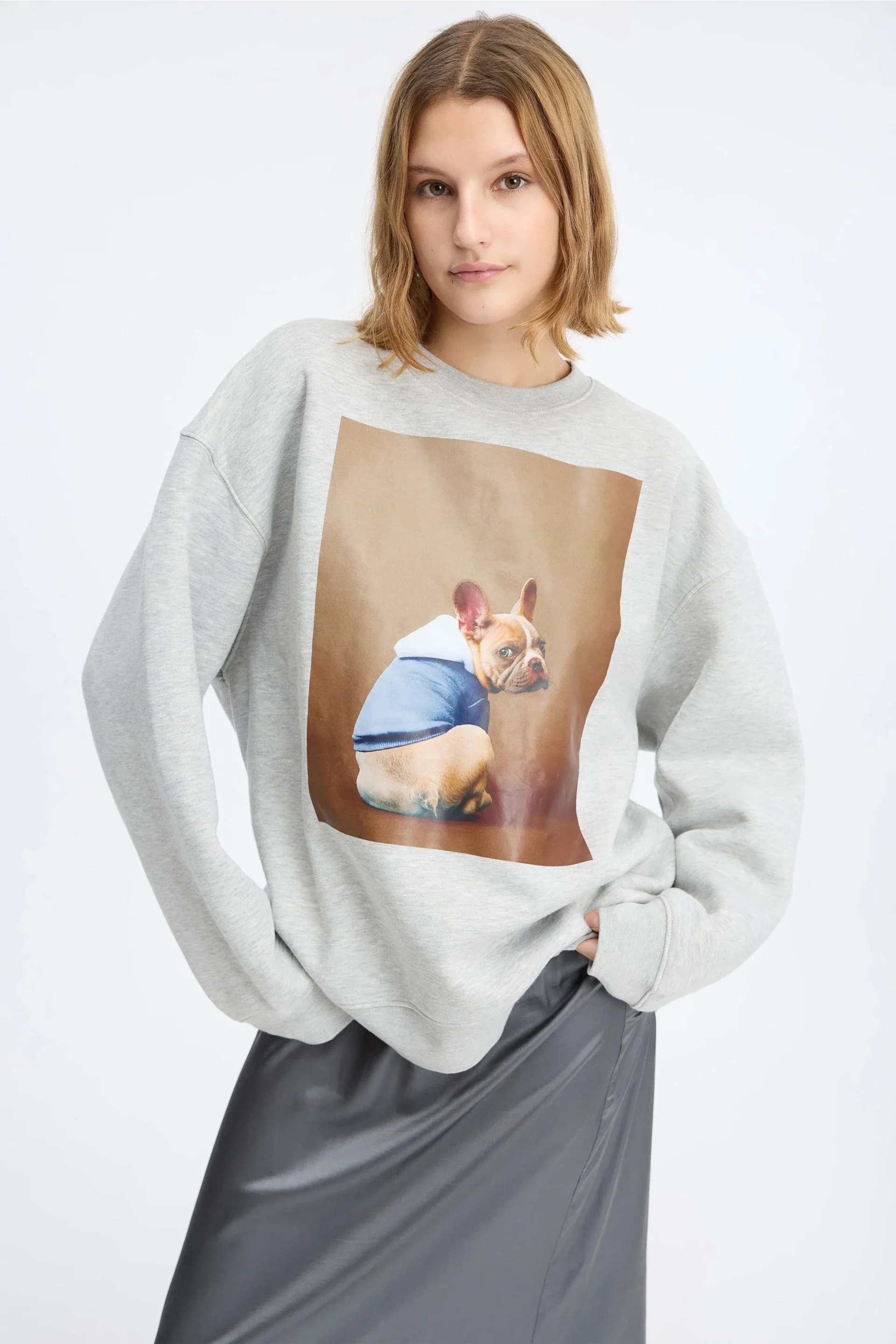 Elegant sweatshirt met een charmante print van een Franse Bulldog in een hoodie op de voorkant en een MUNTHE-logo op de achterkant. Ontworpen met een klassieke ronde hals, lange mouwen en een losse, comfortabele pasvorm.