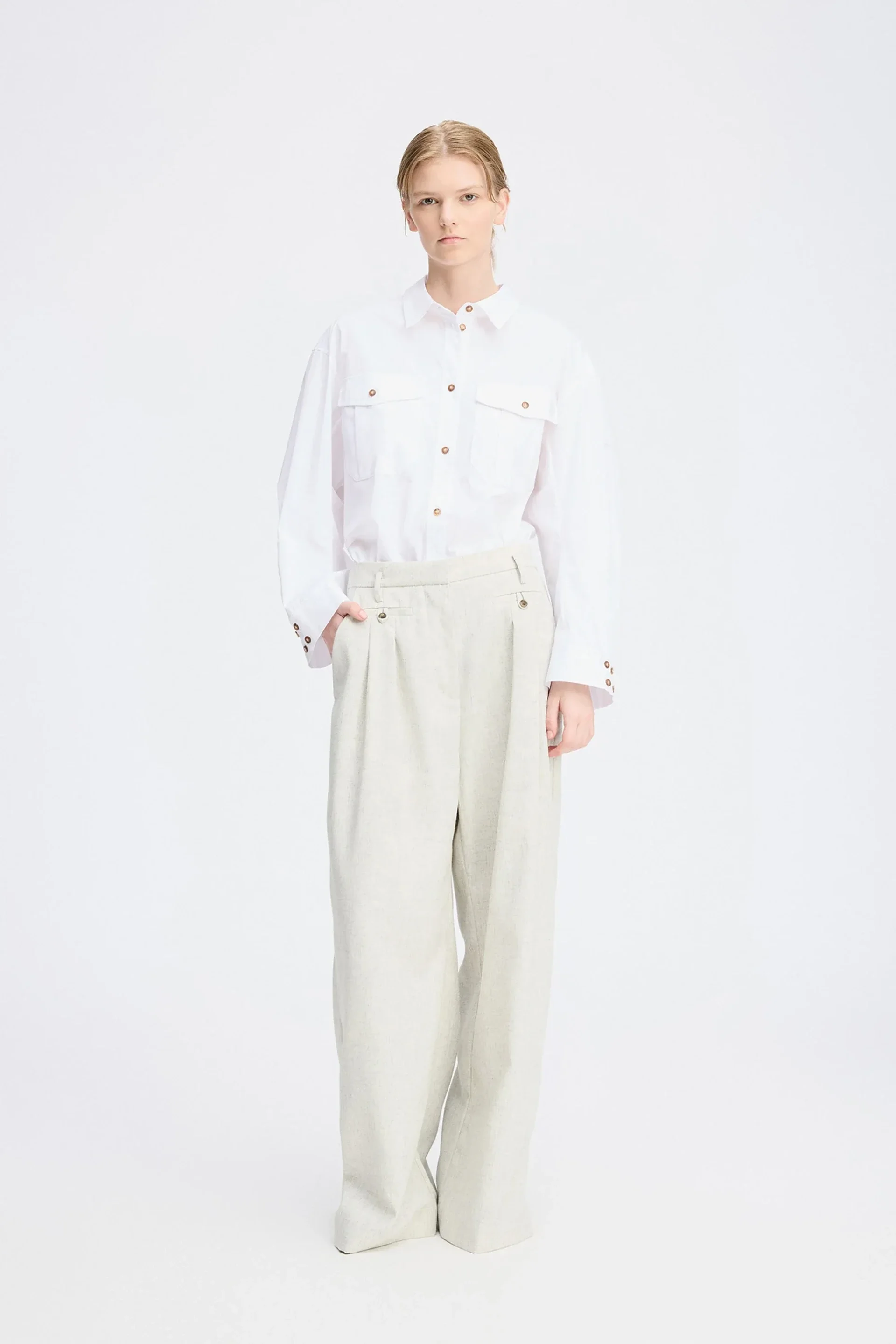 Elegante broek van een gestructureerde stof met wijde pijpen. Deze broek is ontworpen met een hoge taille, plooien aan de voorkant, schuine zijzakken en paspelzakken aan de achterkant met een knoop.