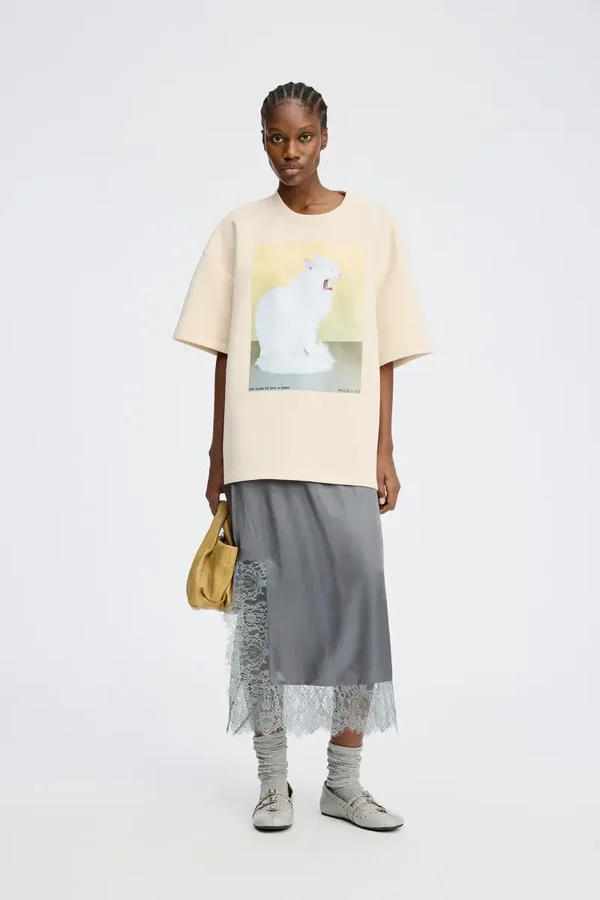 Neopreen blouse met een elegante kattenprint. Deze blouse is oversized, heeft korte mouwen en een ronde hals.