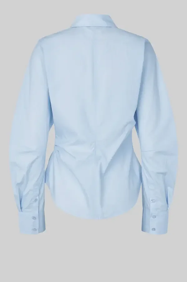 Second Female asymmetric shirt. The shirt is made in smooth organic cotton. Featuring a diagonal button-through fastening. Tucks at side of placket to create draped effect. Long sleeves with buttoned cuffs. Regular, slightly fitted shape.