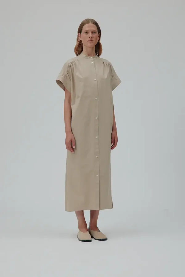 Pauline is a straight-fit dress in 100% crispy Cotton. It features a Mao collar with shiny buttons at the front, short wide sleeves, and pleats extending from the neckline to the sleeves. Falling to calf length, it offers breathable comfort with a simple and elegant silhouette.