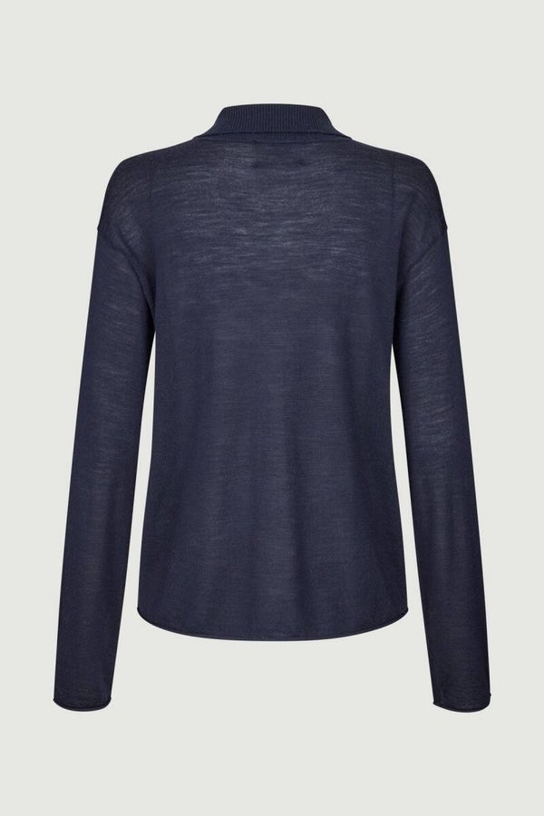 Penny is a long-sleeved polo in 100% fine Merino Wool with a relaxed fit. It features a three-button placket, rolled hem at the bottom, and cuffs finished with a clean edge, creating a classic and versatile piece for everyday wear.