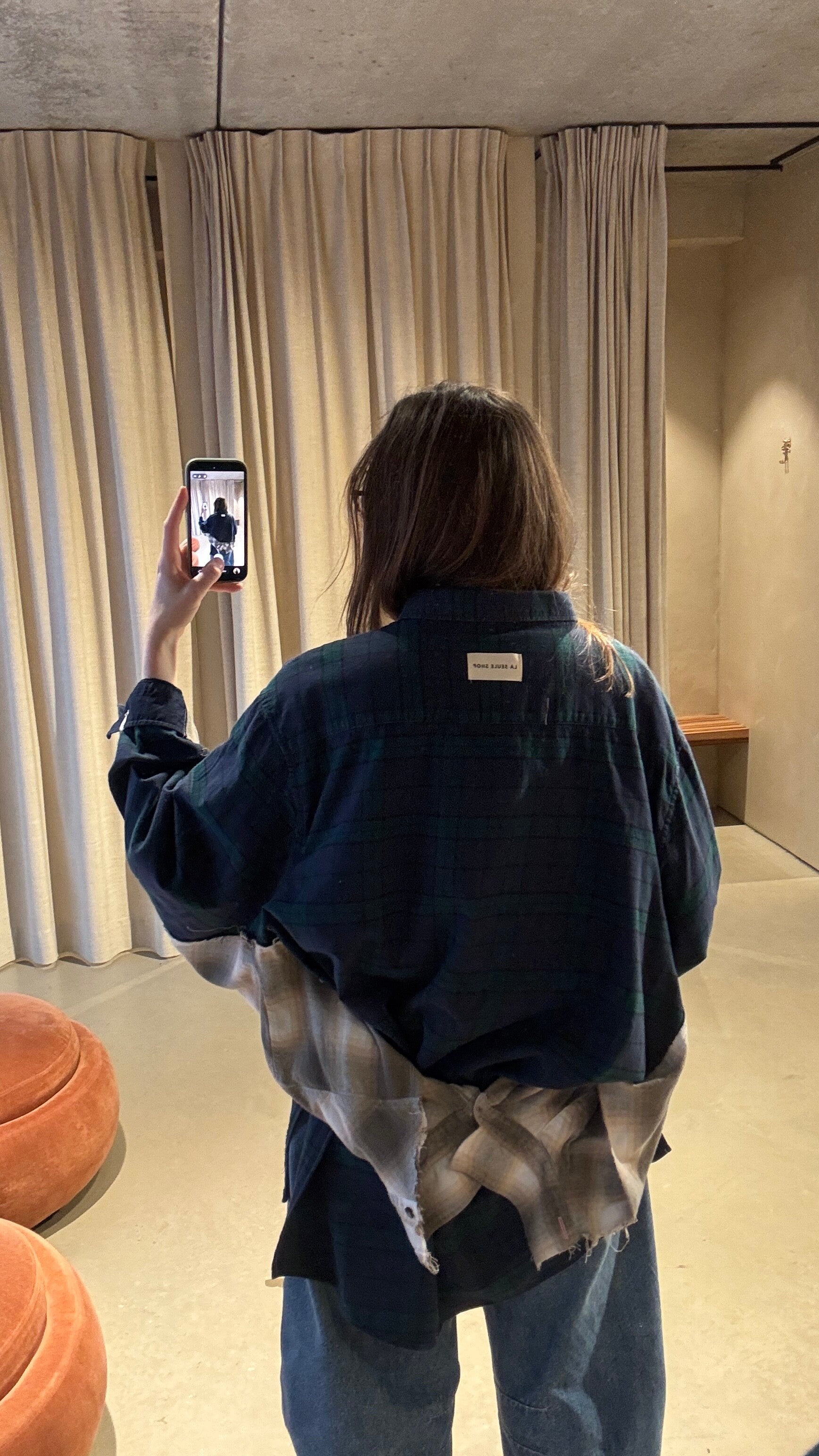 Upcycled oversized hemd van La Seule Shop. Kan je dragen door de knoopjes van de mouwen aan de voorkant of achterkant te knopen. Of gewoon open te dragen.