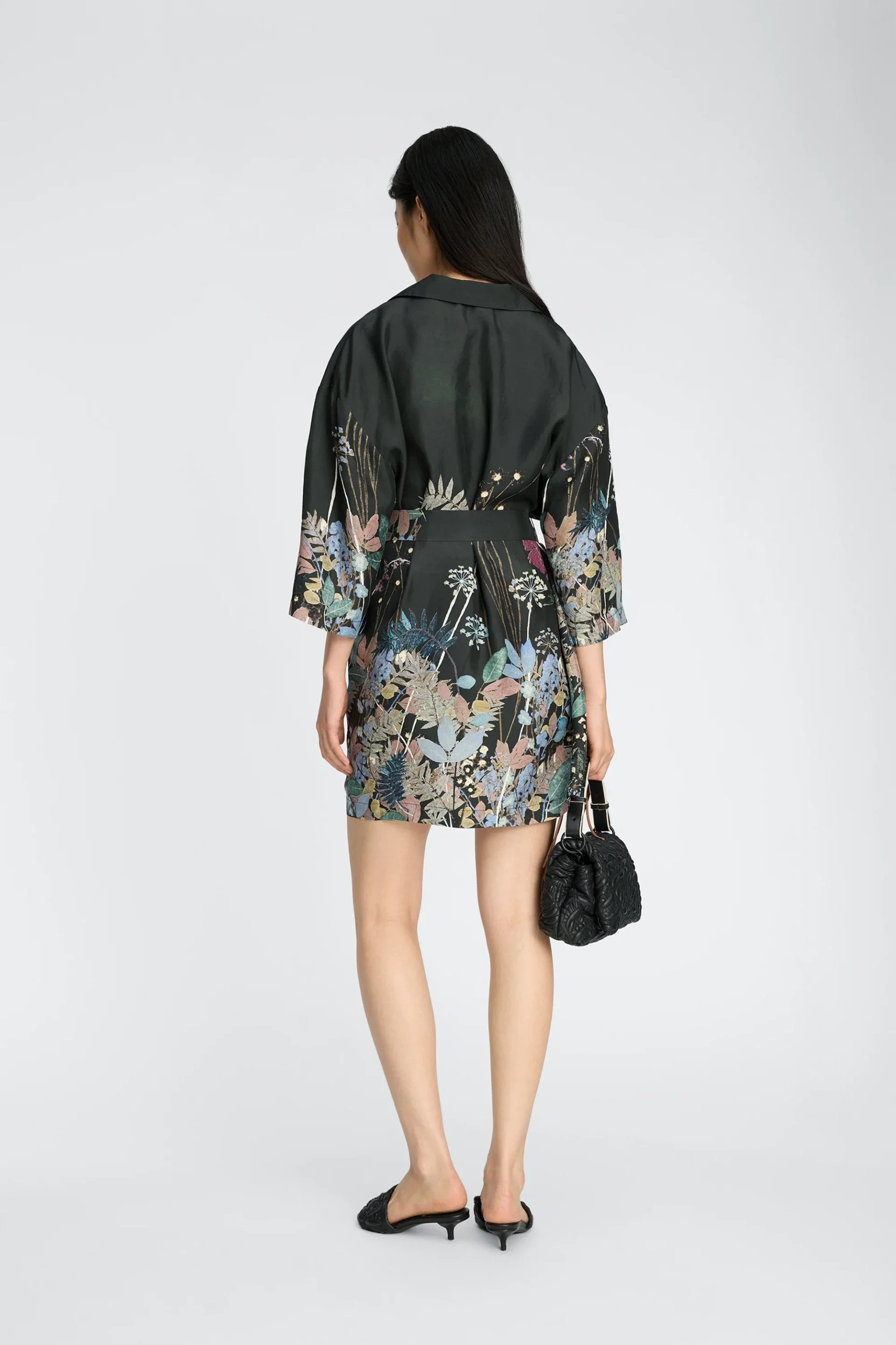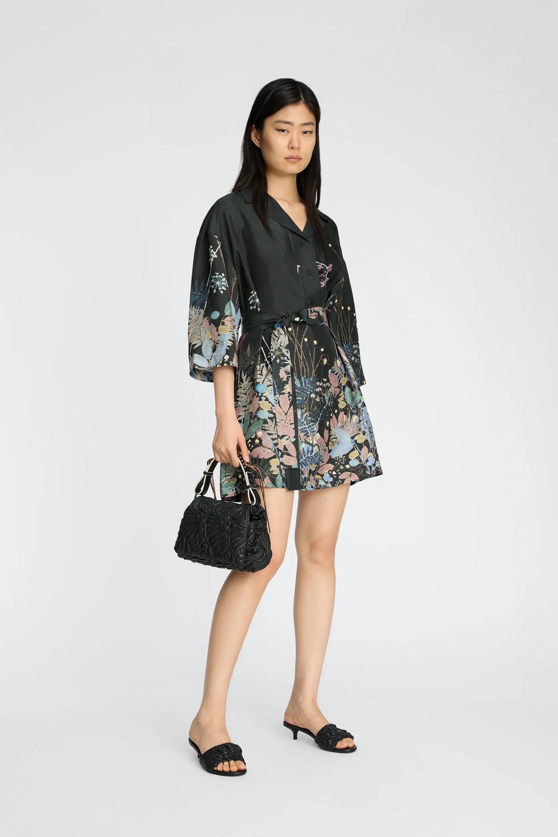 Dress made in 100% silk and with a botanical print. Designed in a loose, short silhouette, it features a shirt collar, short sleeves, and a waist belt.