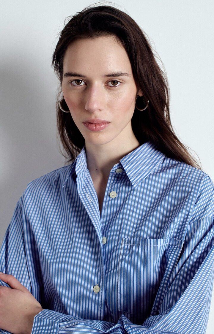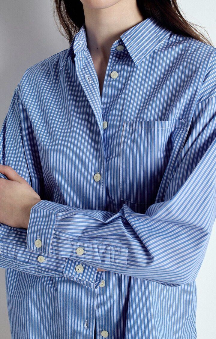 Het ruime Zatybay-shirt voor dames valt op door zijn kenmerkende geweven strepen en zijn soepele, lichte katoenen popeline die zorgt voor comfort en soepelheid. Dankzij de lange mouwen en de ruime pasvorm is dit een veelzijdig kledingstuk dat ideaal is om alleen te dragen voor een verfijnde stijl of als overshirt over een T-shirt voor een casual look.